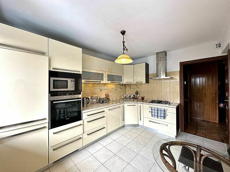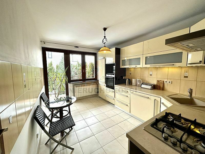 Wysoki Parter obejmuje: przestronny hall, salon z kominkiem/ w wyjściem na balkon, kuchnię z meblami na wymiar i sprzętem AGD( lodówką, kuchenką gazową, zmywarką, piekarnikiem, mikrofalówką), łazienkę z kabiną prysznicową i pralką,