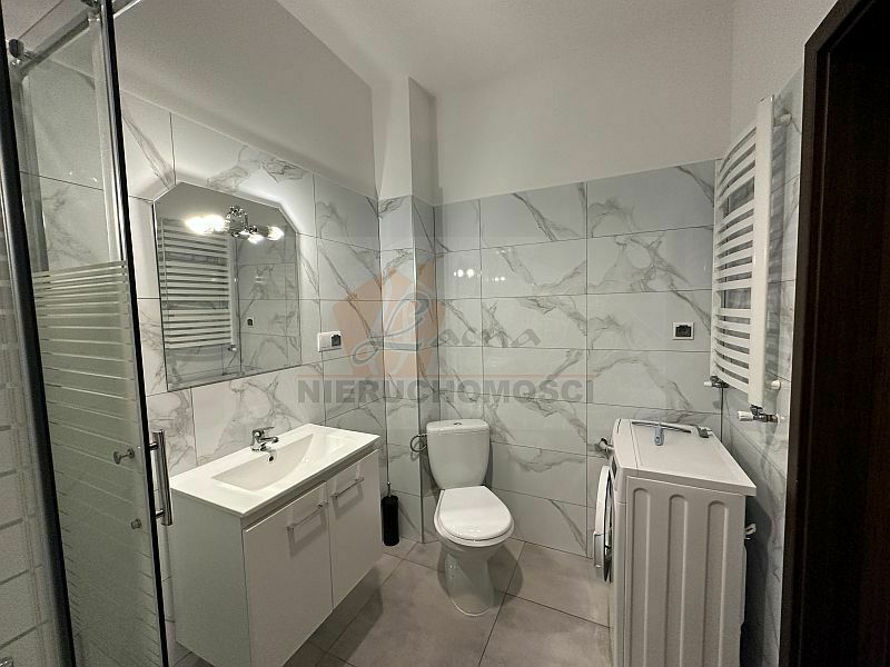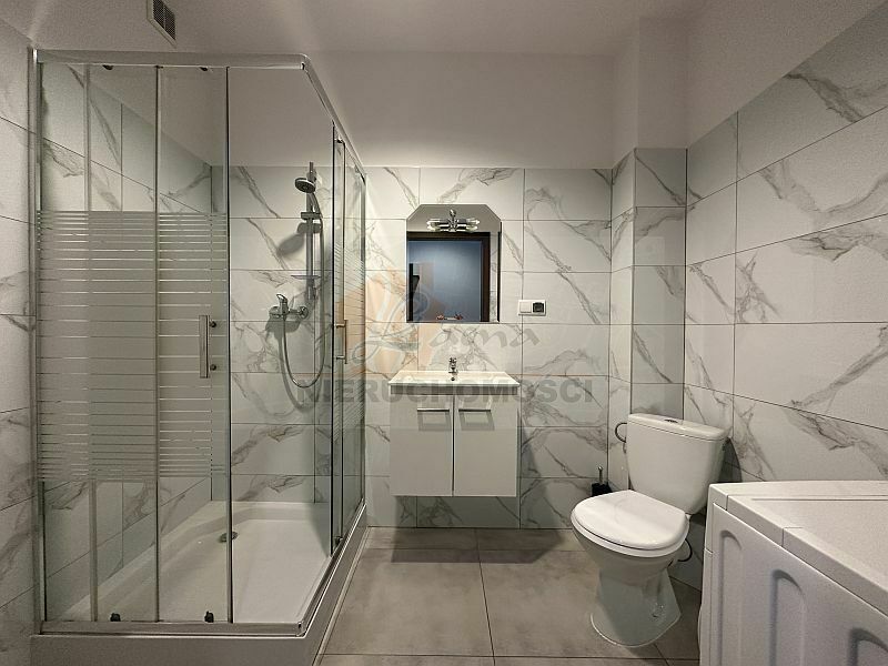 Łazienka z( kabina prysznicową, WC oraz pralką), wyłożona wysokiej klasy płytkami.