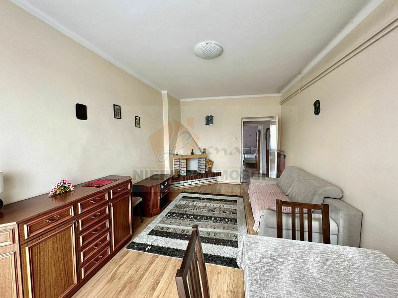 1 pokój z wyjściem na balkon wyposażony w: rozkładaną sofę, stół+ krzesła, komodę, szafki, ozdobny kominek,