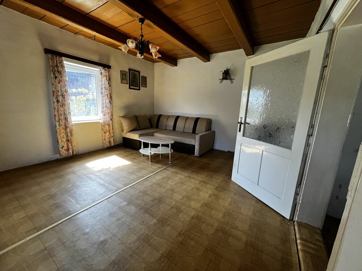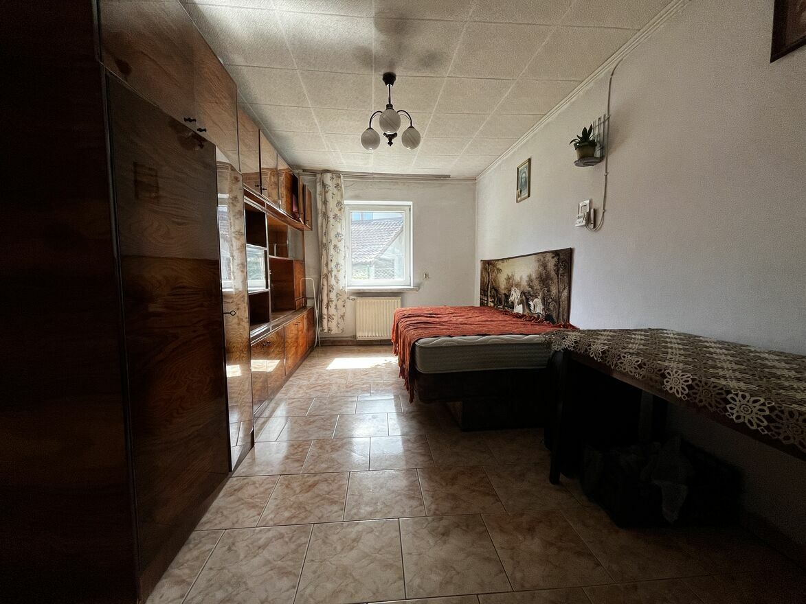 Dom wolnostojący o powierzchni użytkowej 63,03 m² (2 pokoje + kuchnia + łazienka + korytarz). Rok budowy ok. 1930. Stan do remontu – instalacje i pokrycie dachowe wymagają modernizacji. Dzięki temu kupujący ma pełną swobodę aranżacyjną.
