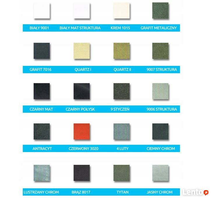 - 25 zł DOPŁATY za kolor czarny mat,czarny połysk,biały mat,antracyt,struktura 9006,grafit 7016. Za pozostałe kolory proszę napisać wiadomość, odpowiemy w szybkim czasie)