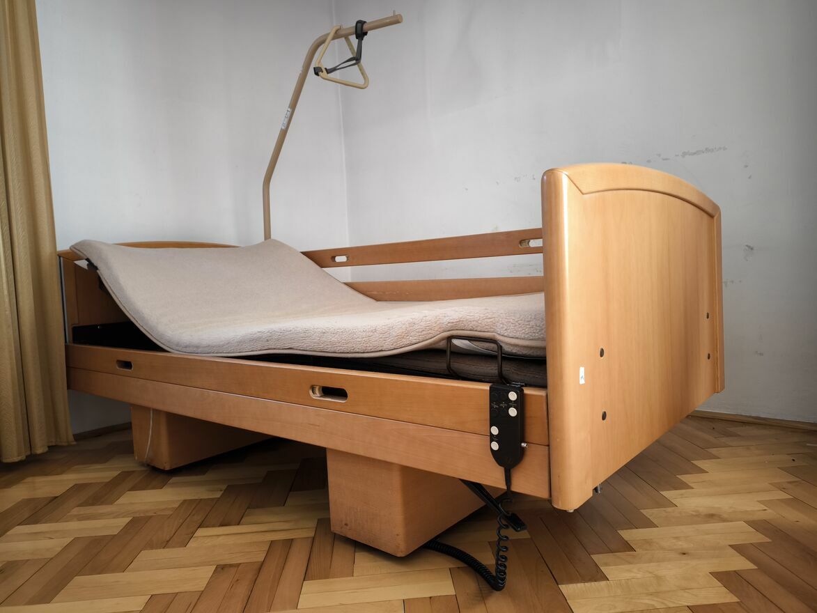 Sprzedam łóżko rehabilitacyjne z elektryczną z regulacją pleców i całego łóżka. Stelaż z materacem ma swoją regulację a łóżko swoją (podnoszenie do góry całego łóżka, tylko przodu lub tylko tyłu). Stan bardzo dobry jak na załączonych zdjęciach. Sterowanie pilotem, koła z hamulcem, trapez do podciągania się, barierka bezpieczeństwa opuszczana z blokadą (pozycja opuszczona na zdjęciu z przodu, po podniesieniu wygląda jak ta barierka podniesiona z drugiej strony łóżka)Dodatkowo materac widoczny na zdjęciu w cenie. Transport i wyniesienie z domu po stronie nabywcy.