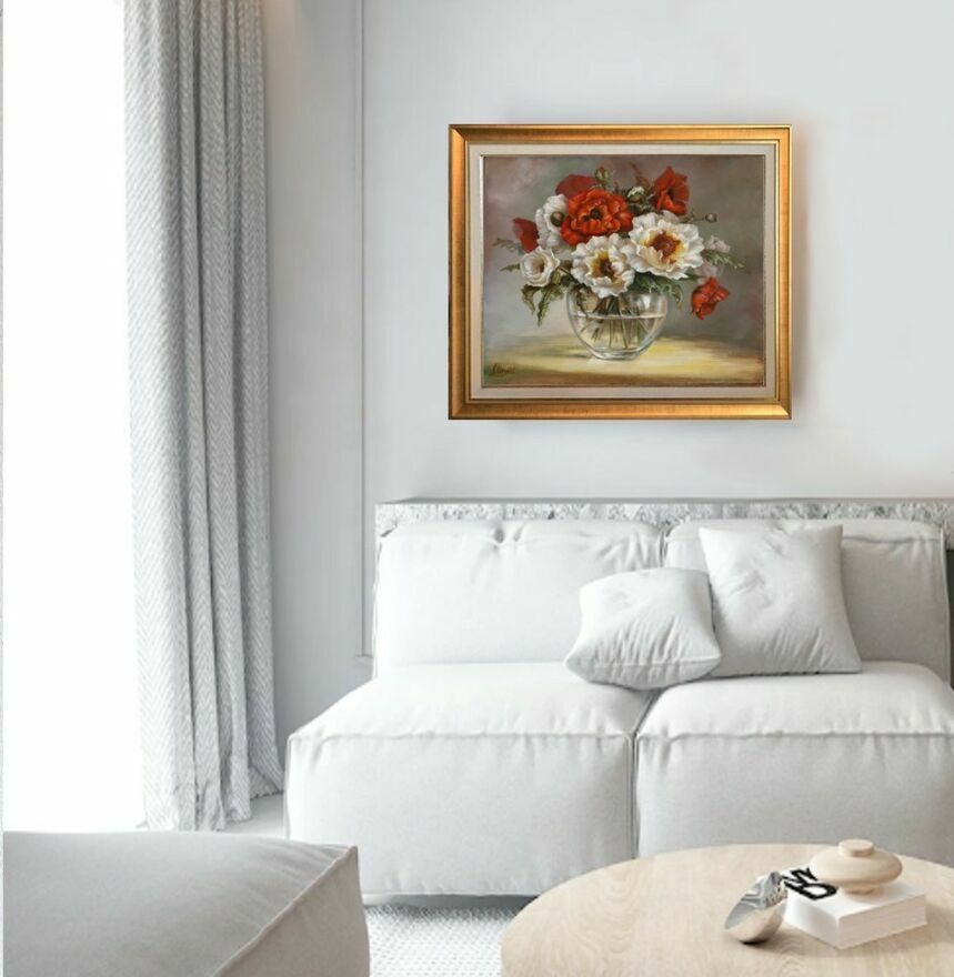 Obraz "Maki - Kwiaty w wazonie" namalowany został profesjonalnymi farbami olejnymi na płótnie bawełnianym naciągniętym na drewnianą ramę (blejtram).