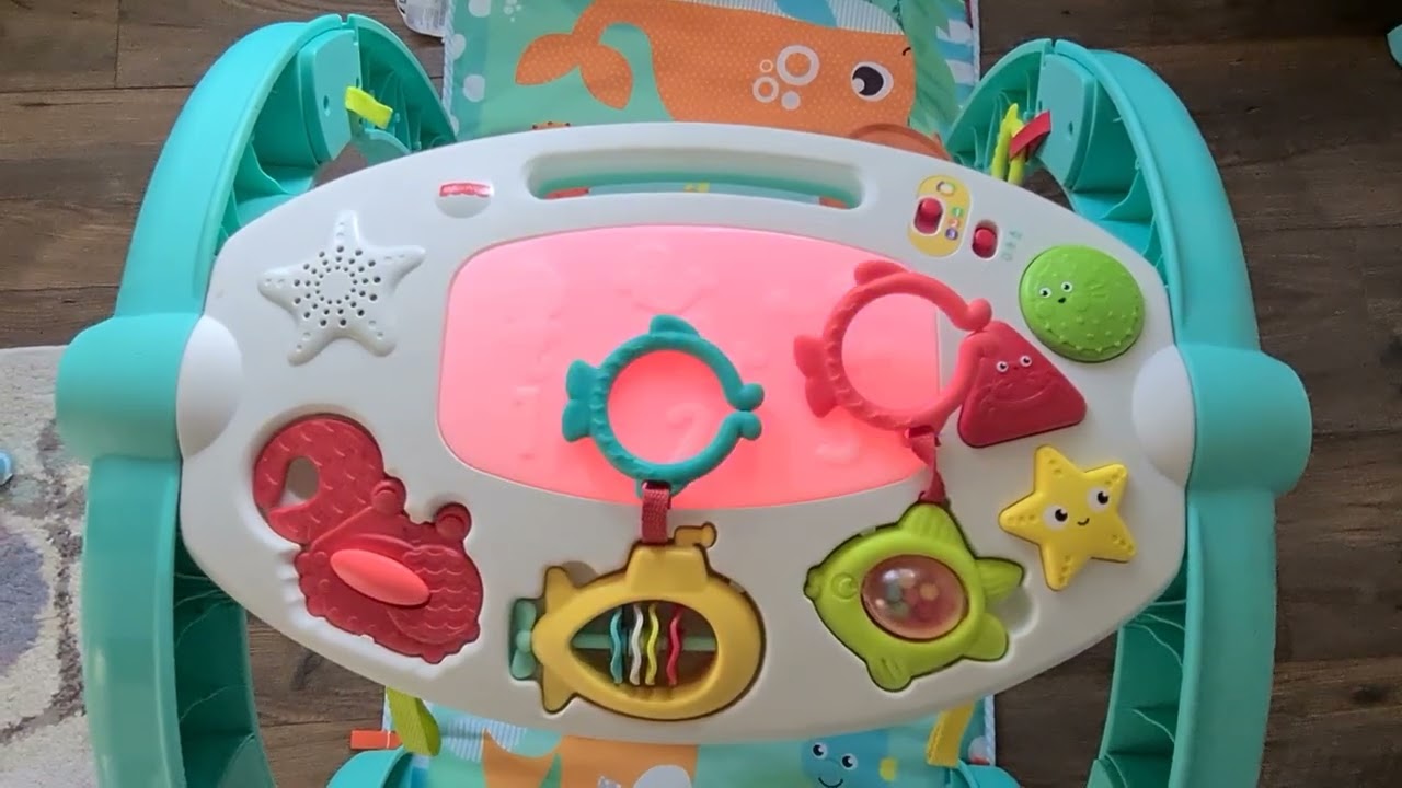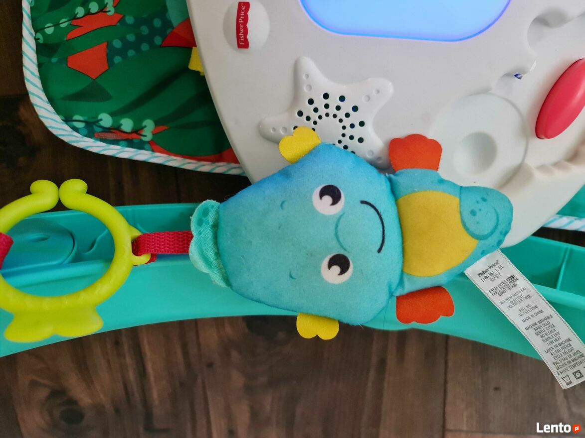 Mata muzyczna Fisher price muzyczny ocean to zabawa dla dziecka w różnych etapach rozwoju. Dla maluszka zabawa na pleckach, tunel do raczkowania, stolik do zabawy na stojąco, przenośny panel do zabaw edukacyjnych.o podświetlany panel elektroniczny z naciskaną rybką, krabem i rozgwiazdą, które uruchamiają wesołe piosenki i dźwięki z elementami do wkładania