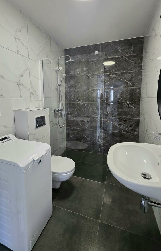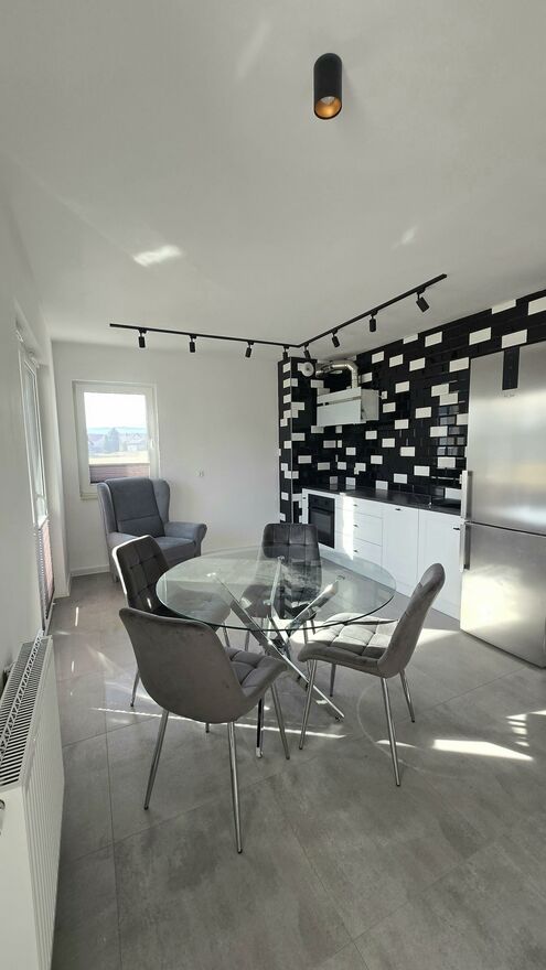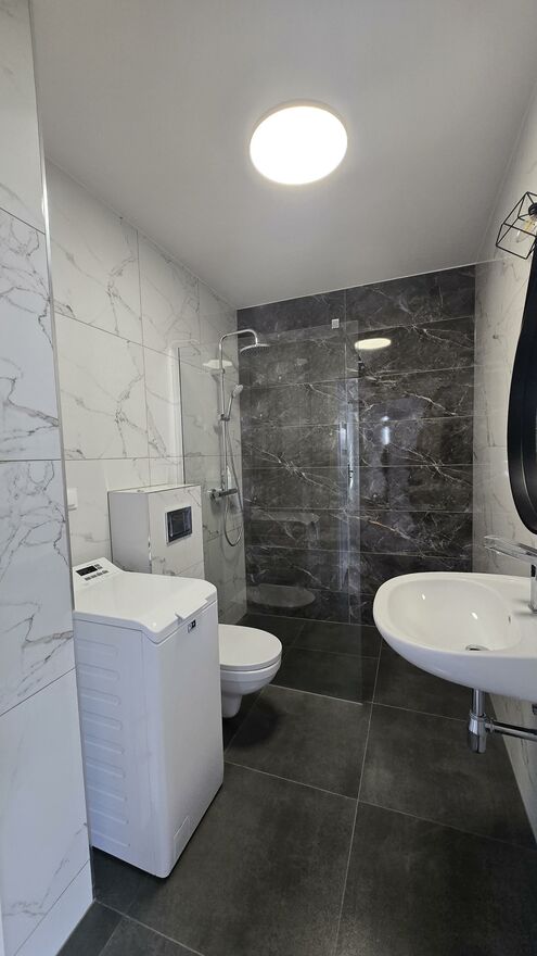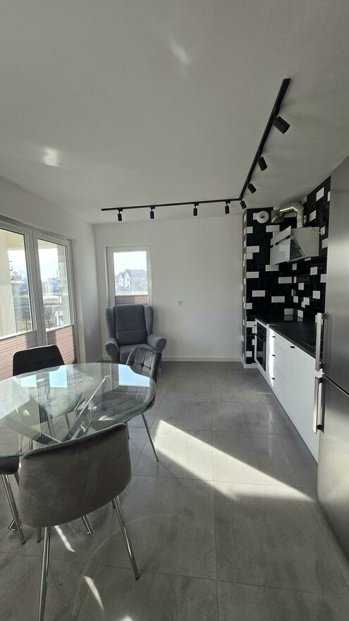 Mieszkanie jest nowe, umeblowane, wykończone materiałami najwyższej jakości. Estetyczna i gustowna przestrzeń. Kuchnia w pełni umeblowana, zawiera sprzęt AGD (lodówka, płyta indukcyjna, piekarnik elektryczny, zmywarka). W łazience pralka.