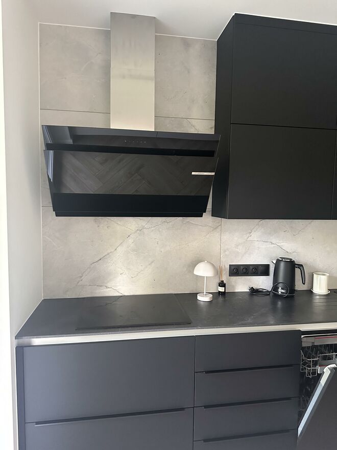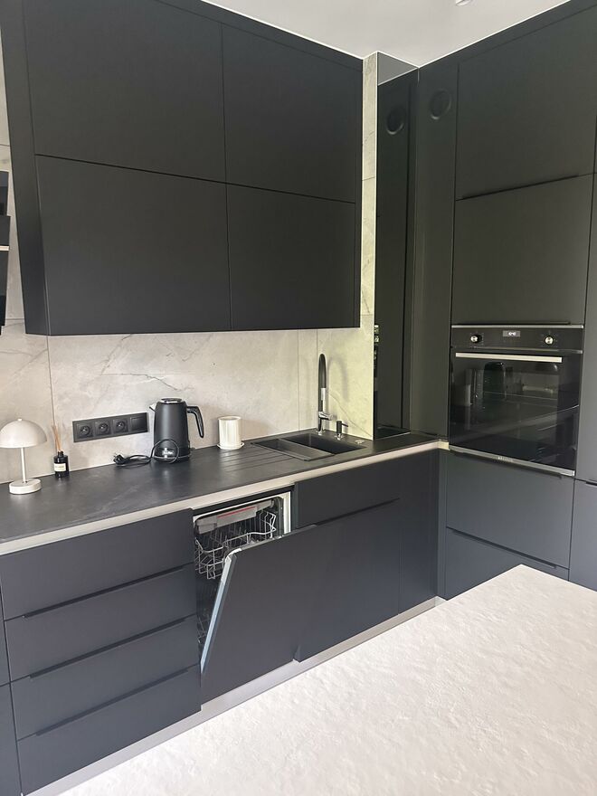 -przestronnego salonu połączonego z kuchnią wyposażoną w sprzęt AGD (lodówkę, płytę indukcyjną, piekarnik, okap, zmywarkę,) Czarna kuchni wpisuje się w nowoczesny oraz luksusowy klimat całego mieszkania.