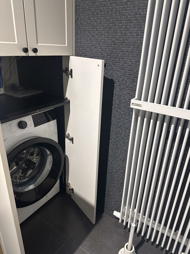 - łazienka z prysznicem, pralką, umywalką, toaletą oraz szafkami podstawowymi.