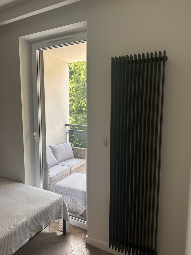 Dodatkowym atutem jest duży balkon, który otacza mieszkanie, wyjście z kilku miejsc, na balkonie znajdują się wygodne rattanowe meble.