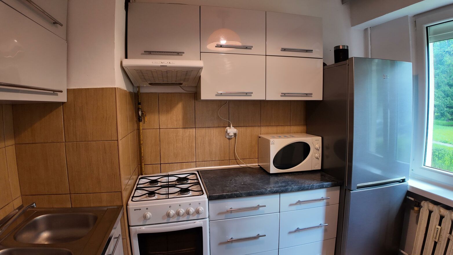 - kuchnia jest wyposażona w lodówko-zamrażarkę, kuchenkę z piekarnikiem, okap oraz mikrofalówkę,