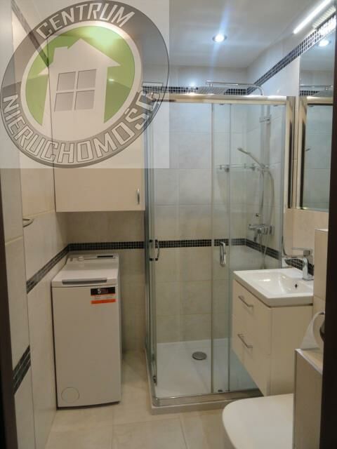 W łazience na podłodze i ścianach płytki ceramiczne- na wyposażeniu kabina prysznicowa, elektryczny podgrzewacz wody "Ariston", szafka z umywalką, podwieszana miska ustępowa, pralka.