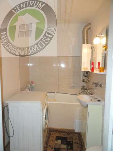 W łazience na podłodze panele, na ścianach płytki ceramiczne- na wyposażeniu wanna, kompakt wc, szafka z umywalką, piecyk gazowy (podgrzanie wody).