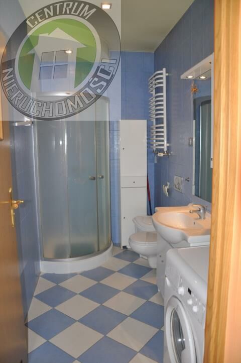 W łazience na podłodze i ścianach płytki ceramiczne- na wyposażeniu kabina prysznicowa, kompakt wc, szafka z umywalką, piec gazowy 2 funkcyjny.