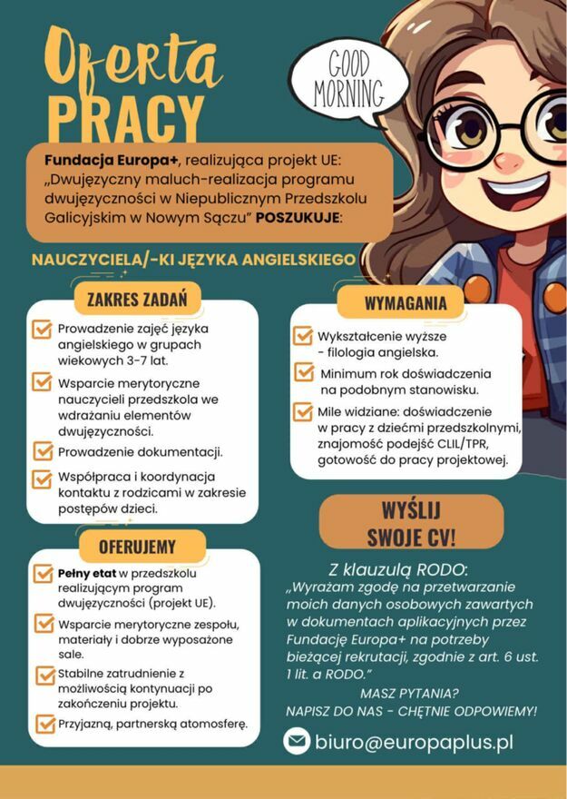 Przedszkole Niepubliczne w Nowym Sączu zatrudni nauczyciela języka angielskiego w wymiarze 1 etatu (40 godzin) na umowę o pracę.Sprawdź zainteresowanie tym ogłoszeniem