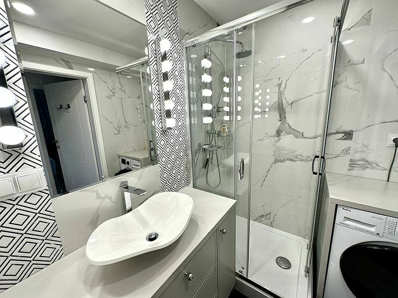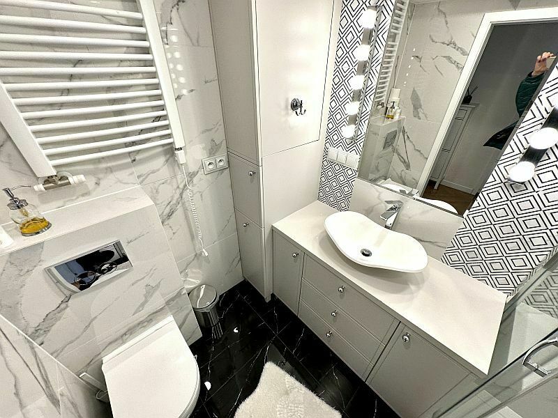 Łazienkę z ( kabiną prysznicową, WC, pralką) wyłożona wysokiej klasy płytkami.