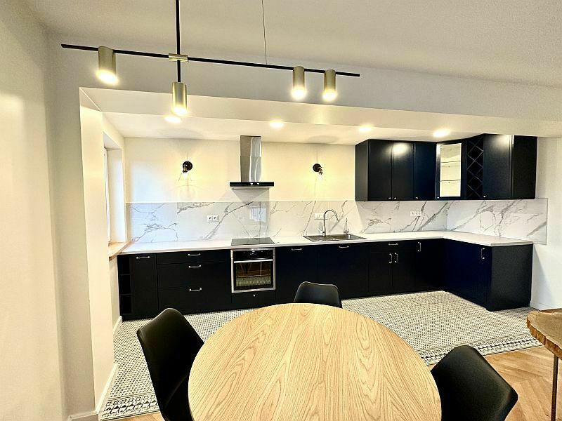 Kuchnię w formie aneksu z pięknymi meblami na wymiar i sprzętem AGD: lodówką, zmywarką, płytą indukcyjną, piekarnikiem, okapem;
