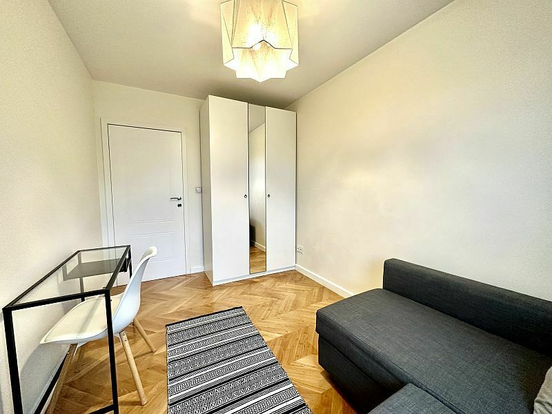 Na podłogach parkiet/ w łazience i przedpokoju płytki;