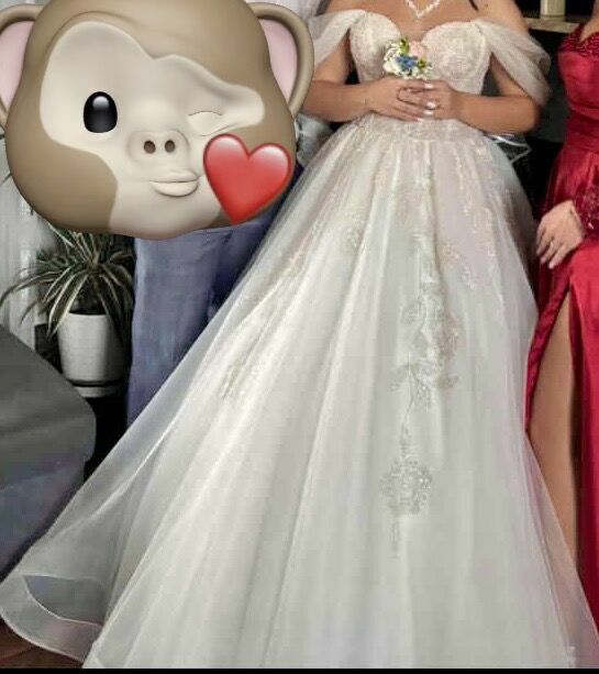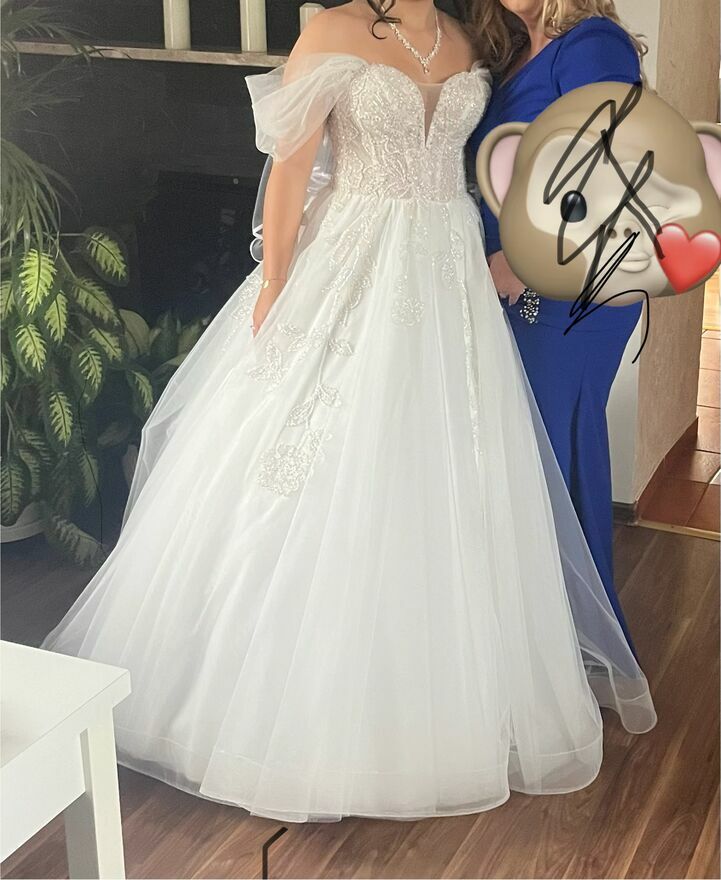 Piękna suknia ślubna w stylu księżniczkowym dla kobiet w kolorze białym. Delikatne zdobienia sprawiają, że każda panna młoda poczuje się jak księżniczka. Suknia używana, idealna na wyjątkowy dzień. Dorzucam do tego halkę welon. Suknia będzie pasować na osobę chudsza jak i grubsza ponieważ ma gorset dopasowujący. Suknia z tyłu jest dłuższa potem można ją przypiąć do stanu taki jak jest z przodu.Suknia jest pakowana w pokrowcu.